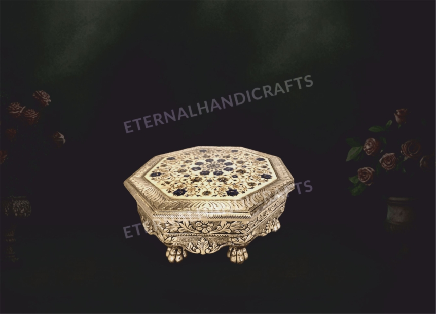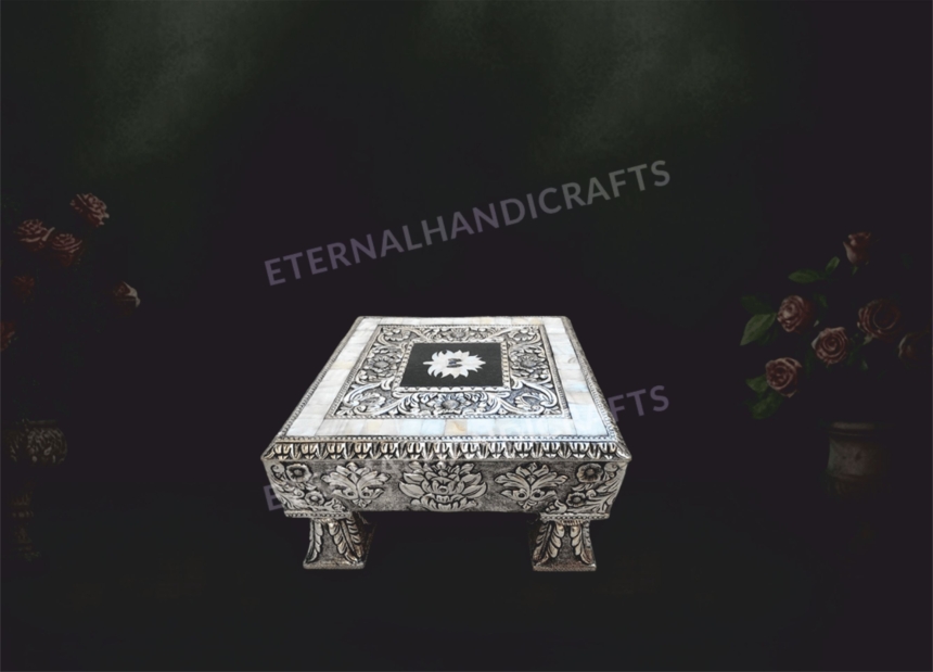 Crafted by artisans at Eternal Handicrafts, each chowki stands out as a unique masterpiece—ideal for pooja rooms, gifting purposes, temple installations, and cultural display units.